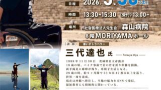 車いすトラベラー 三代達也さんが2度目の世界一周を達成した報告会を開催します。◆講演名 「車椅子から立って見えた景色」◆日 時 5月30日 13:30~15:30【受 付】13:00~◆会 場 社会医療法人元生会 森山病院8階MORIYAM...