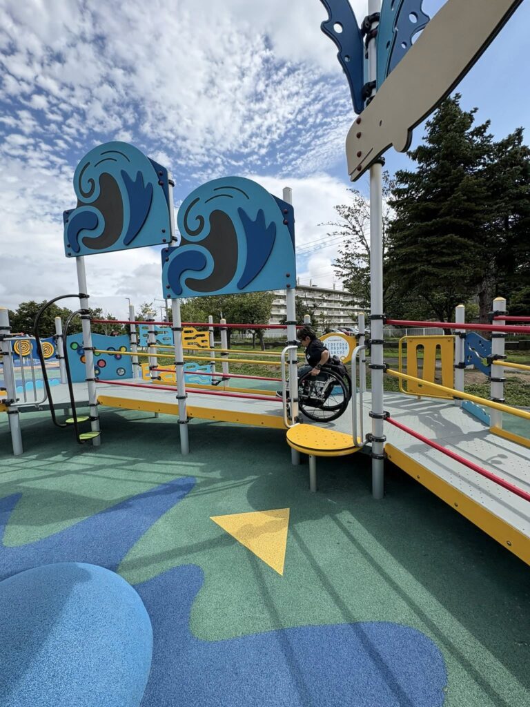 実際に車いすで公園に行くと、地面が砂場ではなくゴムチップになっており