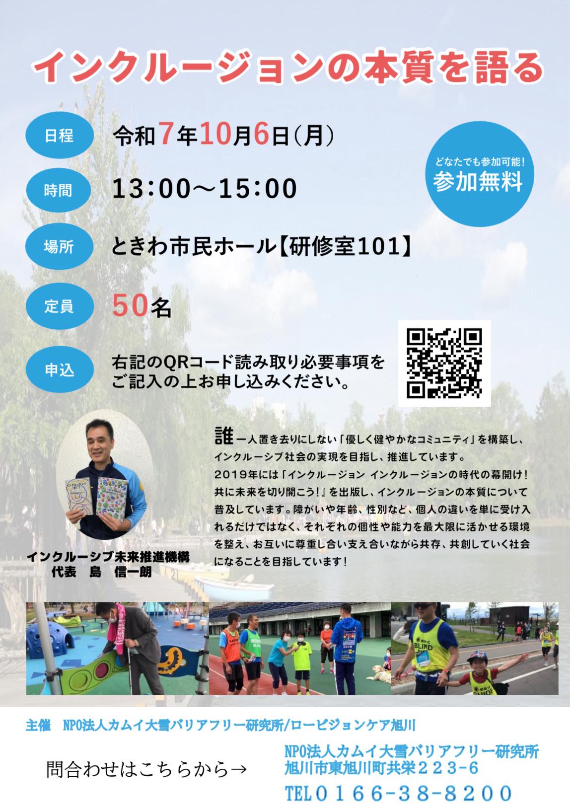 インクルージョンの本質を語る 島 信一朗 出版記念講演 日時:2025.10.6(月)13:00~15:00 場所:ときわ市民ホール 研修室101 参加:無料 【WEB】インクルージョン未来推進機構 インクルージョン未来推進機構 |