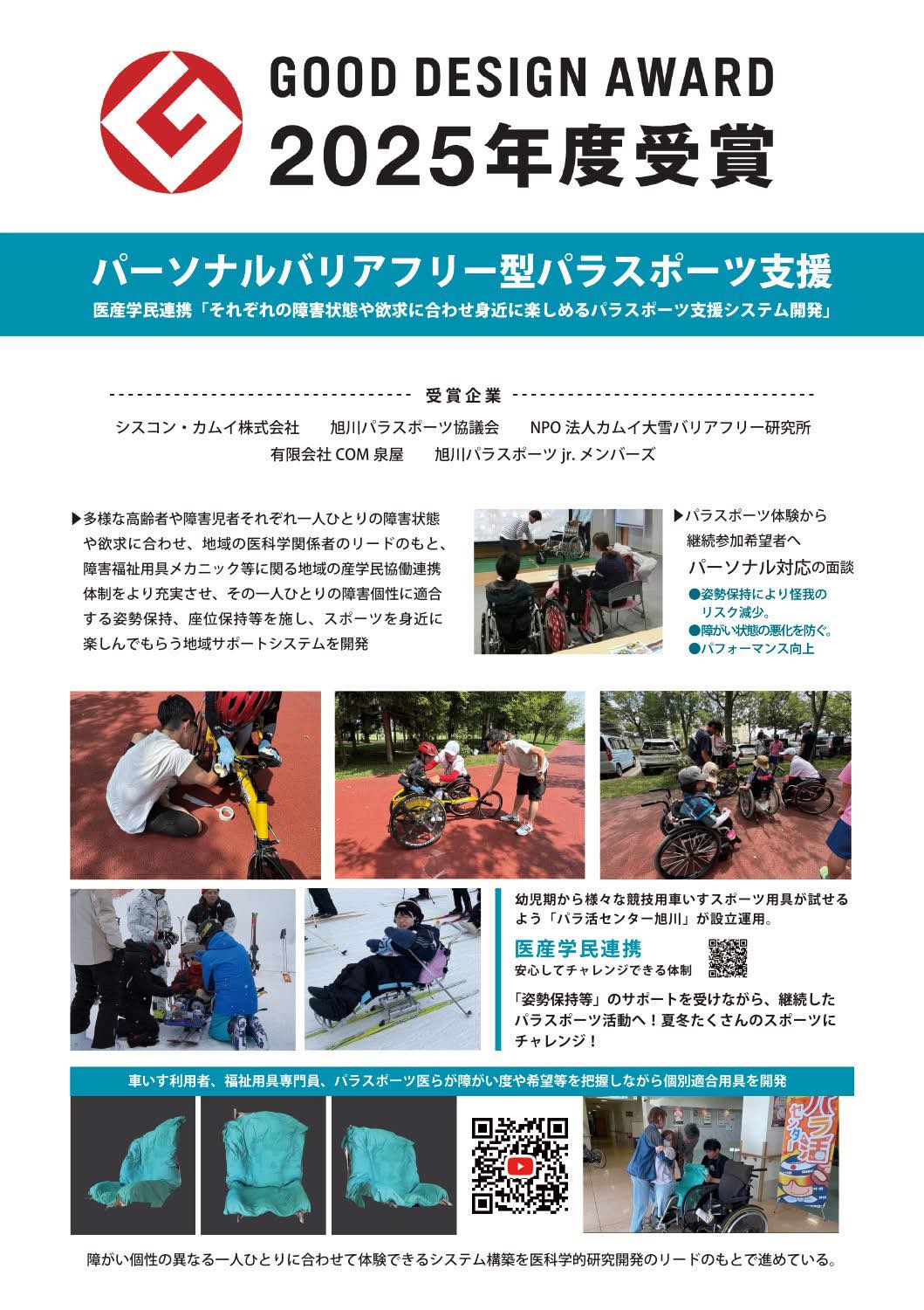 本プロジェクトは、重度障害児者の「自ら操作し楽しむスポーツ参加」を可能にする点で、従来の介護者・介助者が主導するパラスポーツ支援を大きく前進させている。障害ごとの個性や成長段階に応じて設計された用具やシステムは、単なる汎用品ではなく一人ひとりの個別性への対応を具体化したものであり、障害支援とデザインの統合として高く評価できる。また、医産学民の連携により安全性やリハビリ効果を踏まえた開発が進められており、地域に根ざしつつ国際的な知見を取り込む柔軟なデザイン体制も特徴的である。量産よりも一人ひとりに合わせた試作を重視する姿勢は、共生社会におけるスポーツに対するアクセスのあり方を刷新している。