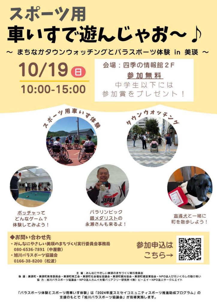【美瑛町 まちなかタウンウォッチング・パラスポーツ体験会】 お知らせ 2025.10.162025.10.28 【美瑛町 まちなかタウンウォッチング・パラスポーツ体験会】 10月19日美瑛町の四季の情報館2Fで ボッチャ体験、スポーツ用車いす体験などの体験会を開催します! お時間ある方はぜひお越しください!沢山のご来場お待ちしております。 申し込みは下記のQRコードから