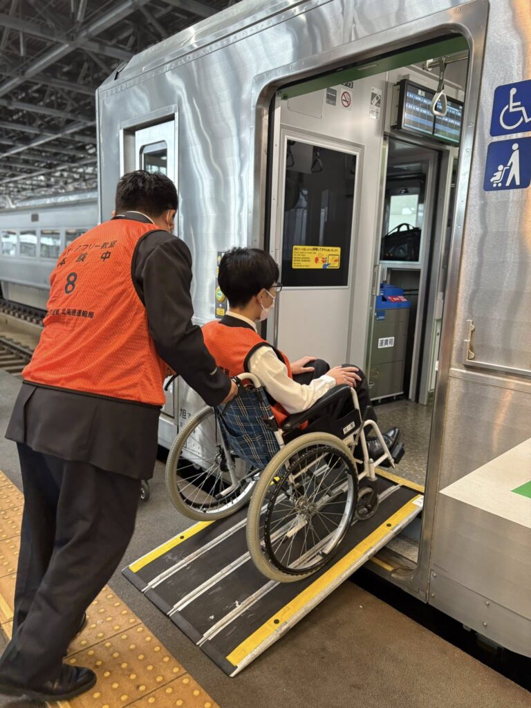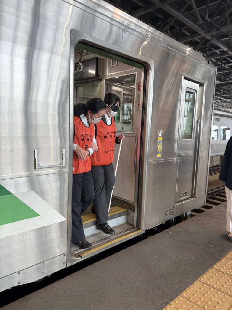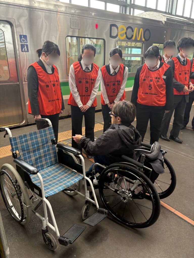 【バリアフリー講習会】 活動報告 2025.10.232025.10.28 10月22日旭川JR駅構内にて、JR北海道職員を対象としたバリアフリー講習会を行いました。 車いすでスロープを使った列車の乗降体験や、視覚障がい者疑似体験としてアイマスクや 白杖を使い、列車やエスカレーターの乗降・介助方法を体験していただきました! 介助をする際の声掛けや、介助方法など様々ですが、疑似体験を通して 知っていただくきっかけになれば嬉しいなと思います! JRを利用する際、いつも安心して乗ることができています。ありがとうございます!