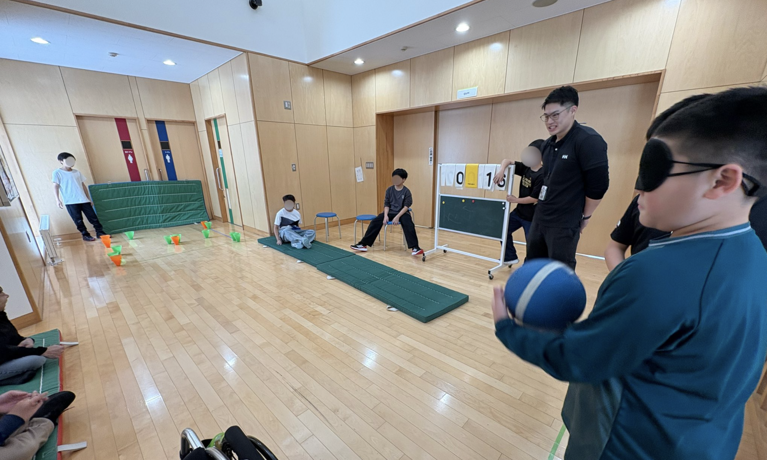 東小学校では、目隠しボーリング、室内カーリング、当たってはいけないゴールボール、