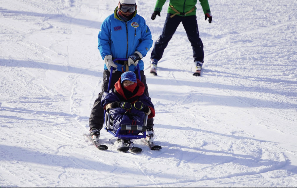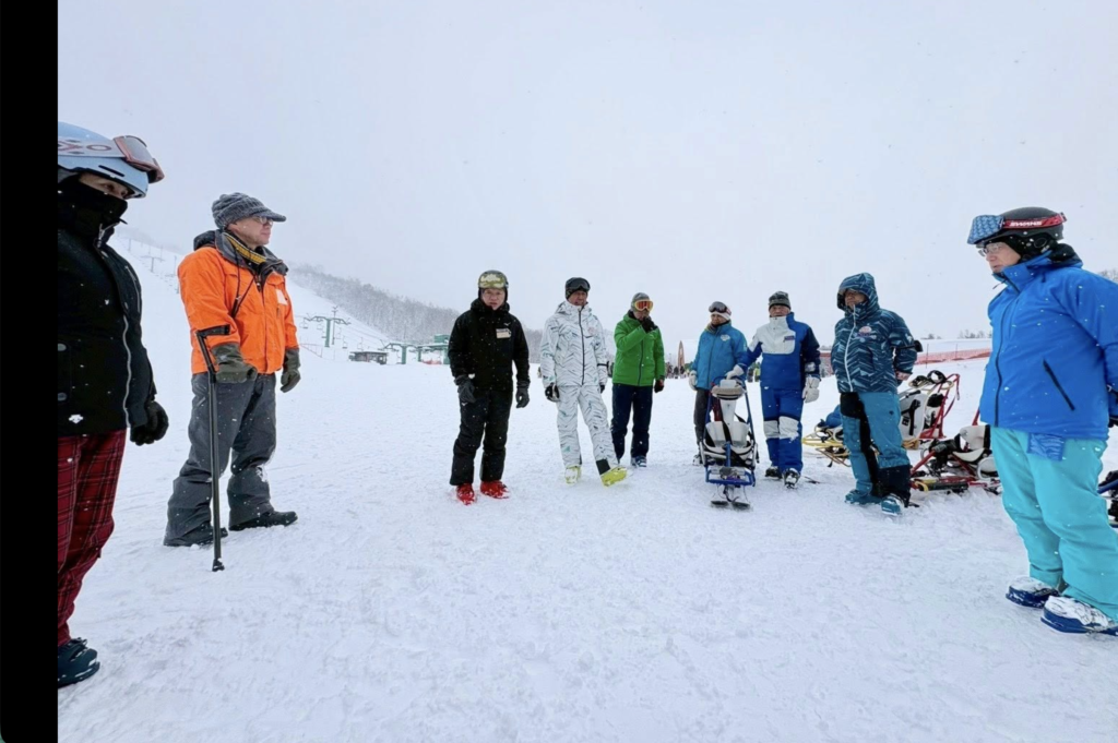 旭川シュプールクラブのバイスキー体験ということで、実際にバイスキーに乗って体験をしたり、障がいを持った子どもたちが学校で一緒にスキー授業に参加できるよう学校の先生方の育成を行っています。