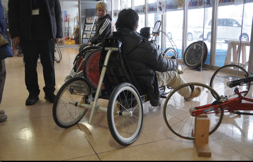 視察ということで、私たちがどんな活動をしているのか、仕事や生活、活動の環境づくりとしてパラスポーツからどのようにまちづくりをしているのかについてお話をさせていただきました。その後は、パラスポーツ体験として、バーチャルアーチェリー、競技用車いす乗車体験も行いました。