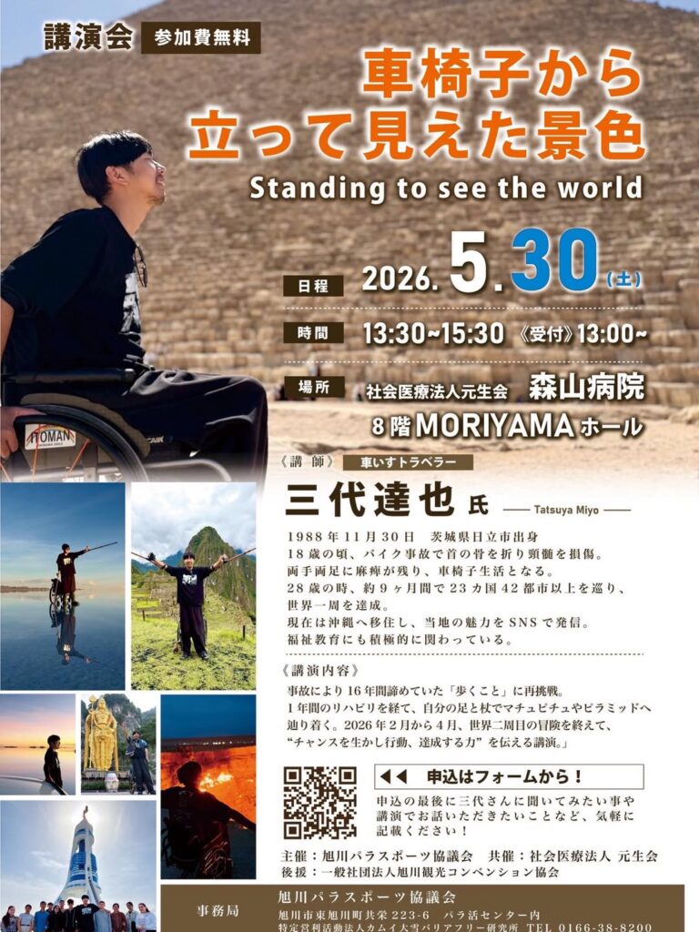 【三代達也 〜車椅子から立って見えた景色〜】 お知らせ 2026.04.202026.04.22 車いすトラベラー 三代達也さんが2度目の世界一周を達成した報告会を開催します。◆講演名 「車椅子から立って見えた景色」◆日 時 5月30日 13:30~15:30【受 付】13:00~◆会 場 社会医療法人元生会 森山病院8階MORIYAMAホール◆参加費 無料お時間ある方はぜひお越しください。また申し込みは紅蓮インスタプロフィールハイライトから!申込時に三代さんに聞きたいこと、講演でお話いただきたいことなど、お気軽に記載ください!!たくさんのご参加お待ちしております!